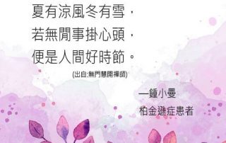 「春有百花秋有月,夏有涼風冬有雪,若無閒事掛心頭,便是人間好時節。」柏金遜患者鍾小曼藉這一首襌詞勉勵大家,無論身處何時何地,只要做自己喜歡的事,不要被其他煩惱困擾,專心享受當中的過程便是人生中最美好的時光。 故事重溫:https://www.facebook.com/lifepavilion30/videos/2923969917823365 #生命同行館 #香港病人組織聯盟 #英國阿斯利康 #HKAPO #AZHK